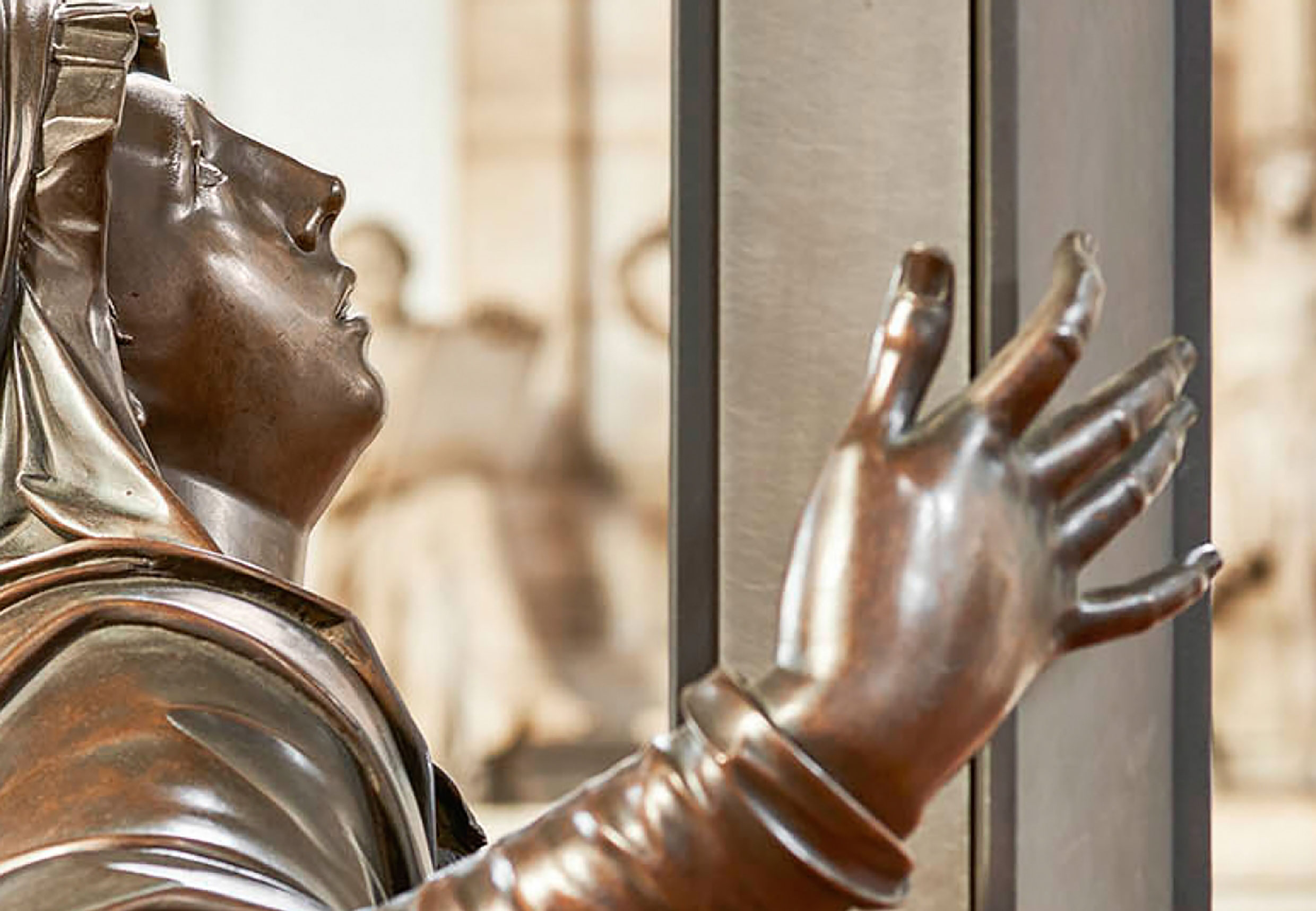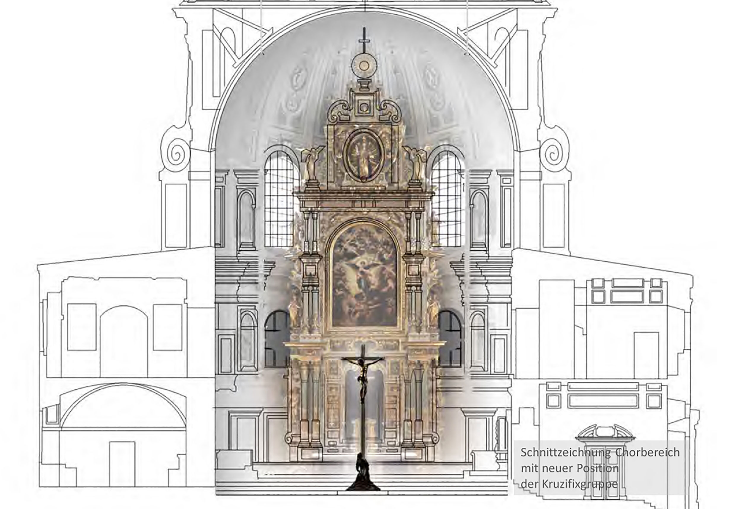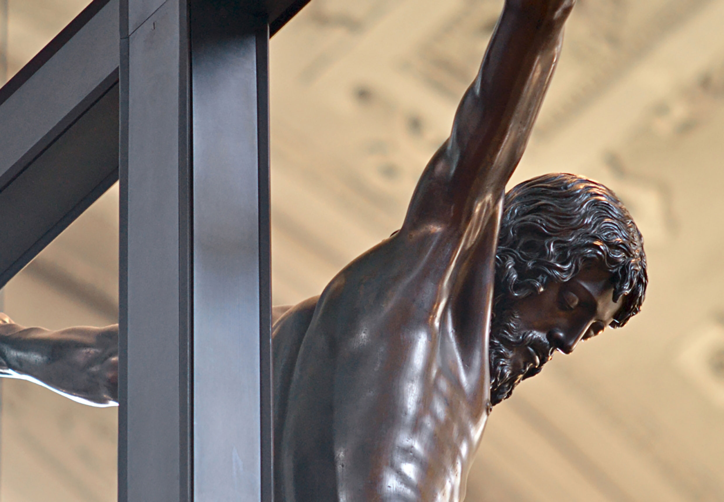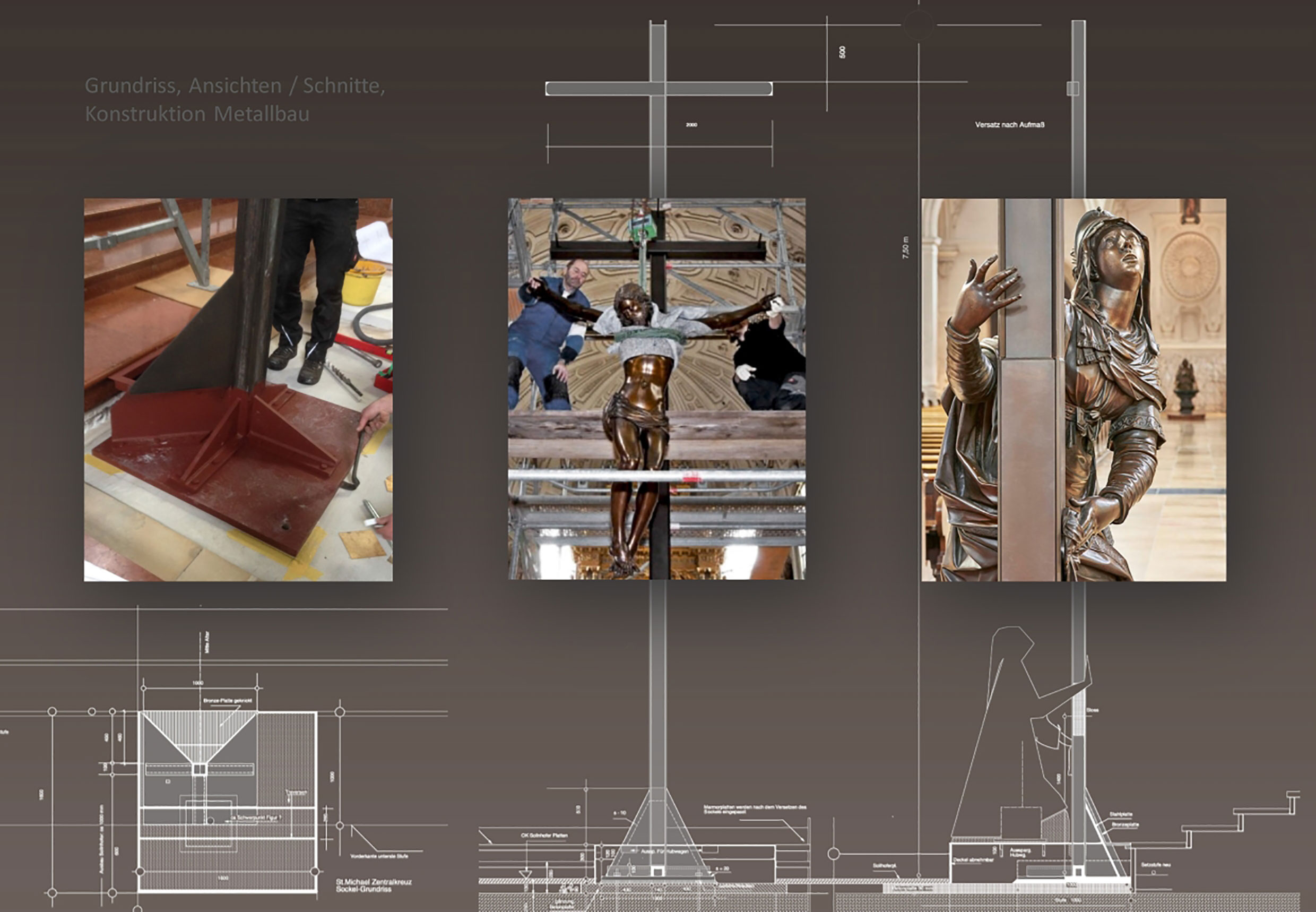 A new bronze-steel construction retrieves the Giambologna Crucifix and Maria-Magdalena to the middle of St. Michael church